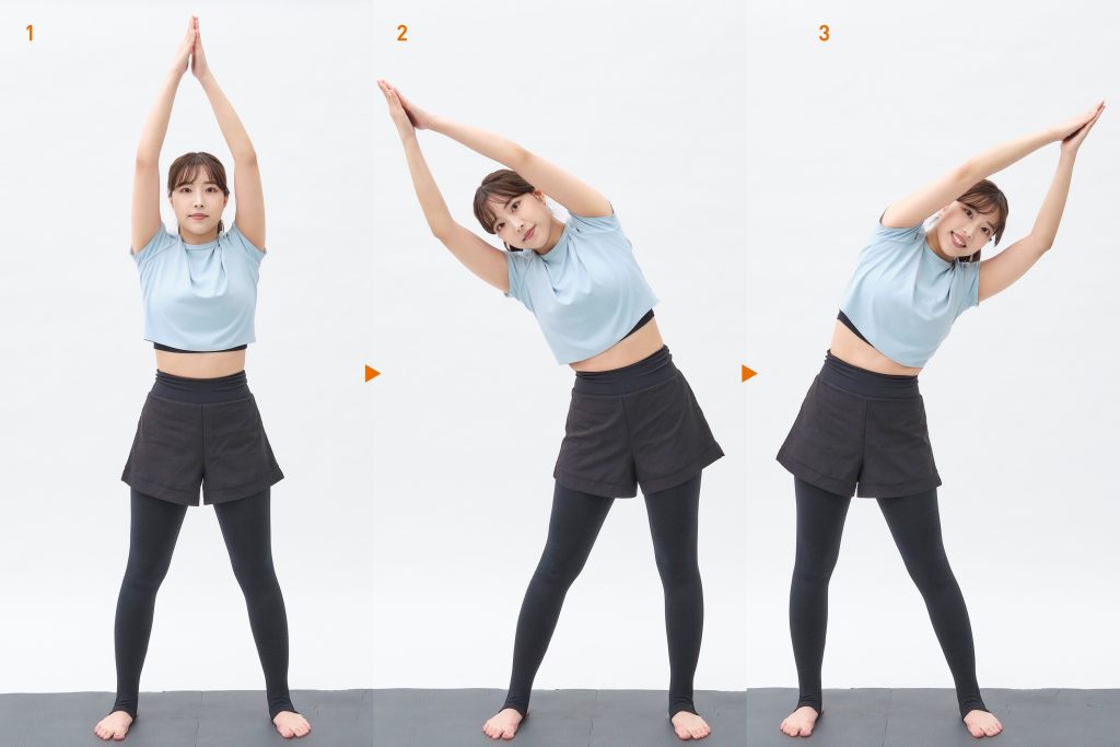 両脚を閉じ、両手を上げたまま上半身を真横に倒す