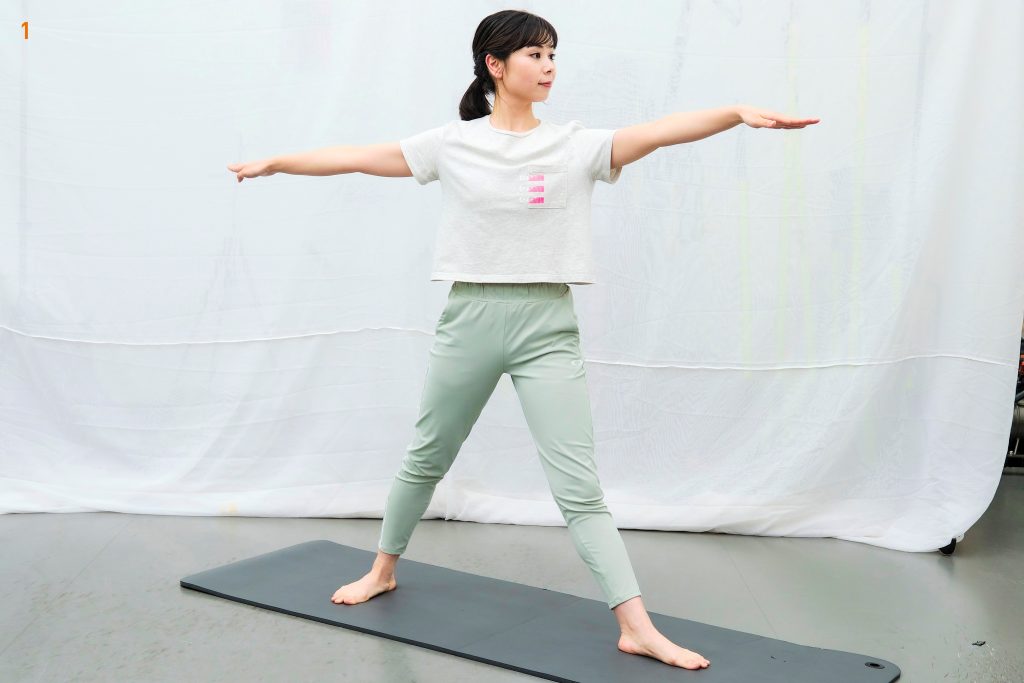 左手と左足を前にして、両腕と両脚を前後に広げた姿勢でスタート。足の向きは、左足が前向き、右足が横向きです。そこから左足に少しずつ体重をかけ、深く沈み込んでいきます。1呼吸(2~3秒)で沈み込み、1呼吸キープし、1呼吸で元に戻ります。これを5回繰り返します。(3呼吸×5回)