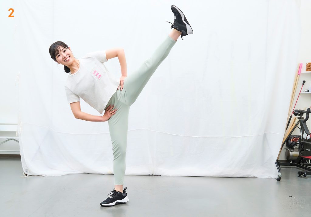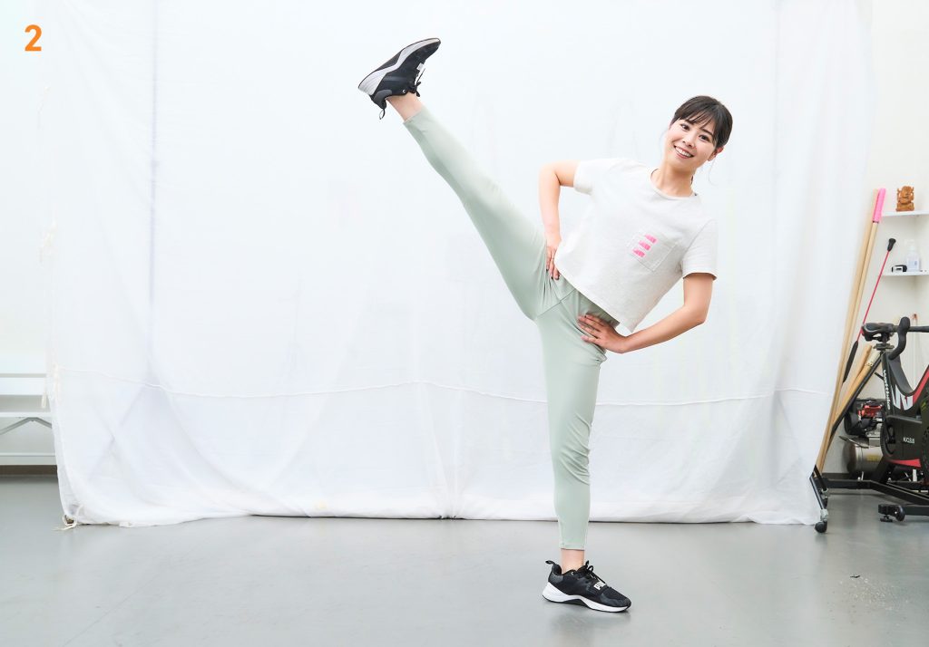 今回はポーズ1と2を交互に行います。ポーズ1が終わった姿勢から、そのままポーズ2に移行する感じです。今度は左足に体重を乗せ、バランスを取りながら右足を高く上げます。その際、反対の足を下ろした反動で勢いをつけるのではなく、ゆっくり動くことを心がけてください。(2~3呼吸×5回)