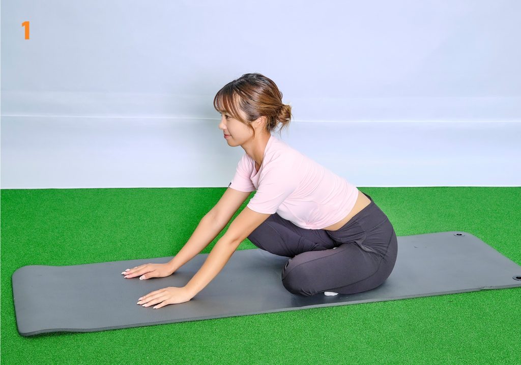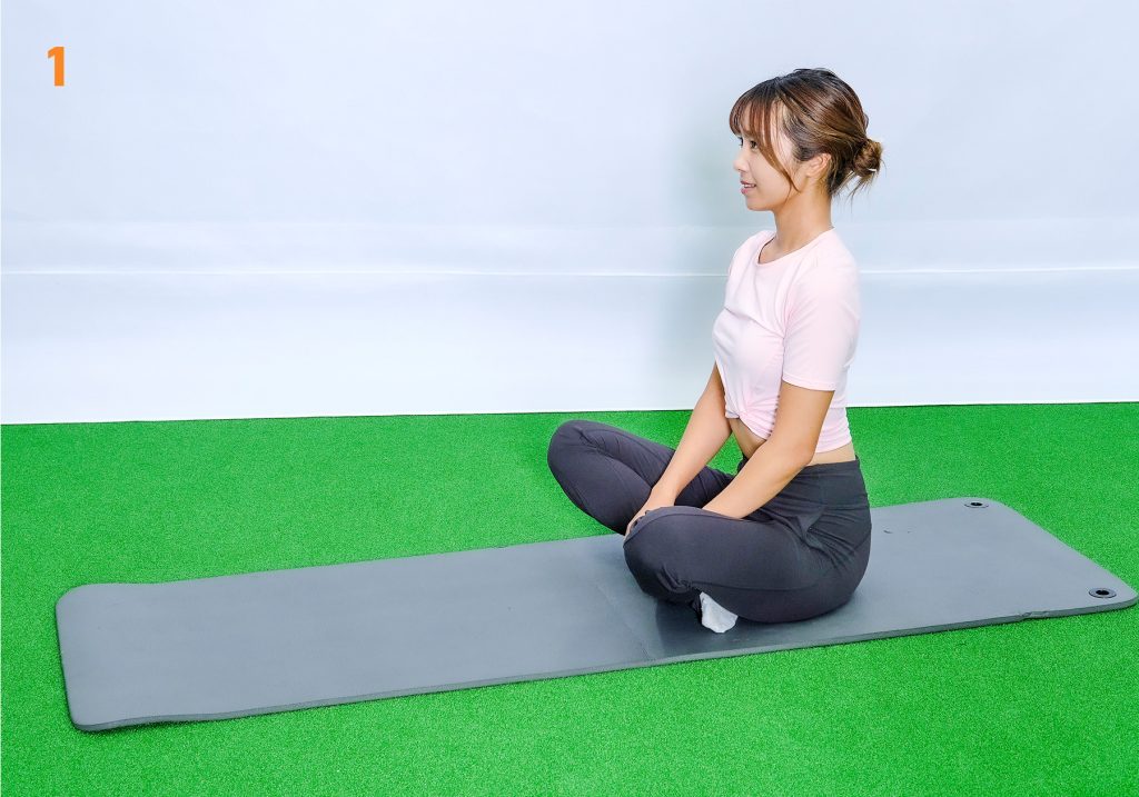マットの上にあぐらをかいた姿勢でスタート。そこから上半身を前屈させ、腰を丸めながら伸ばします。1呼吸(2~3秒)で前屈し、2~3呼吸キープし、1呼吸で元に戻ります。それを3回行います。足を組み替えると刺激が変わるので両方行うと左右バランスよく伸ばすことができます。(4~5呼吸×3回)