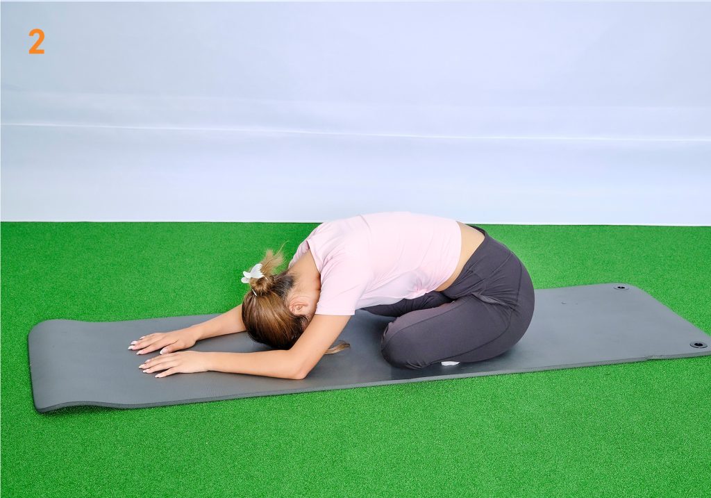 ポーズ1はマットにひじをつけますが、2はおでこをつけます。前屈がさらに深くなります。ただし、体の柔軟性は人それぞれですから、おでこをつけるのが難しければ、無理に行う必要はありません。まずはポーズ1を重点的に行い、慣れてきたらポーズ2に移行してください。(4~5呼吸×3回)