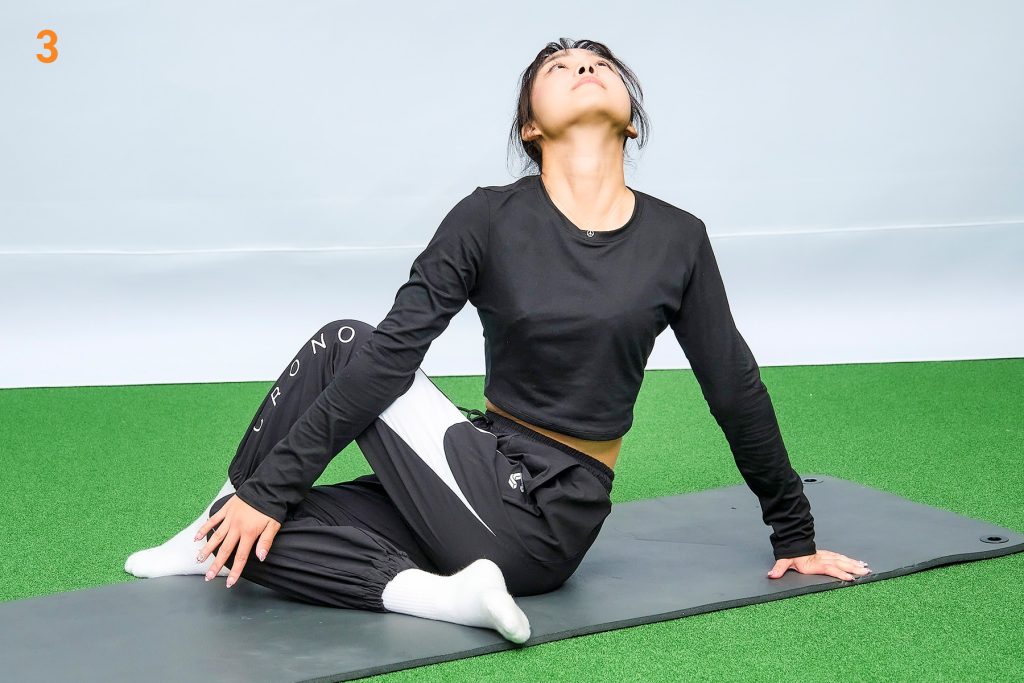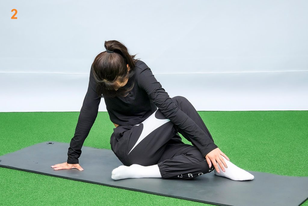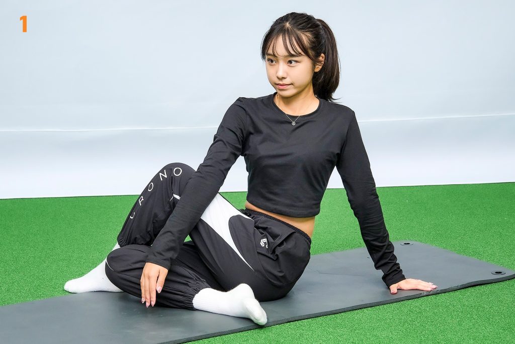 左脚を曲げて座り、右脚をクロスして右ひざを左腕で押さえるように絡めた姿勢でスタート。そして左ひじを右ひざに引っかけて体をひねります。1呼吸(2~3秒)で背中を丸めて下を向き、1呼吸で背筋を伸ばして上を向きます。右手でマットをしっかり押すのが姿勢を安定させるコツです。(2呼吸×5回)