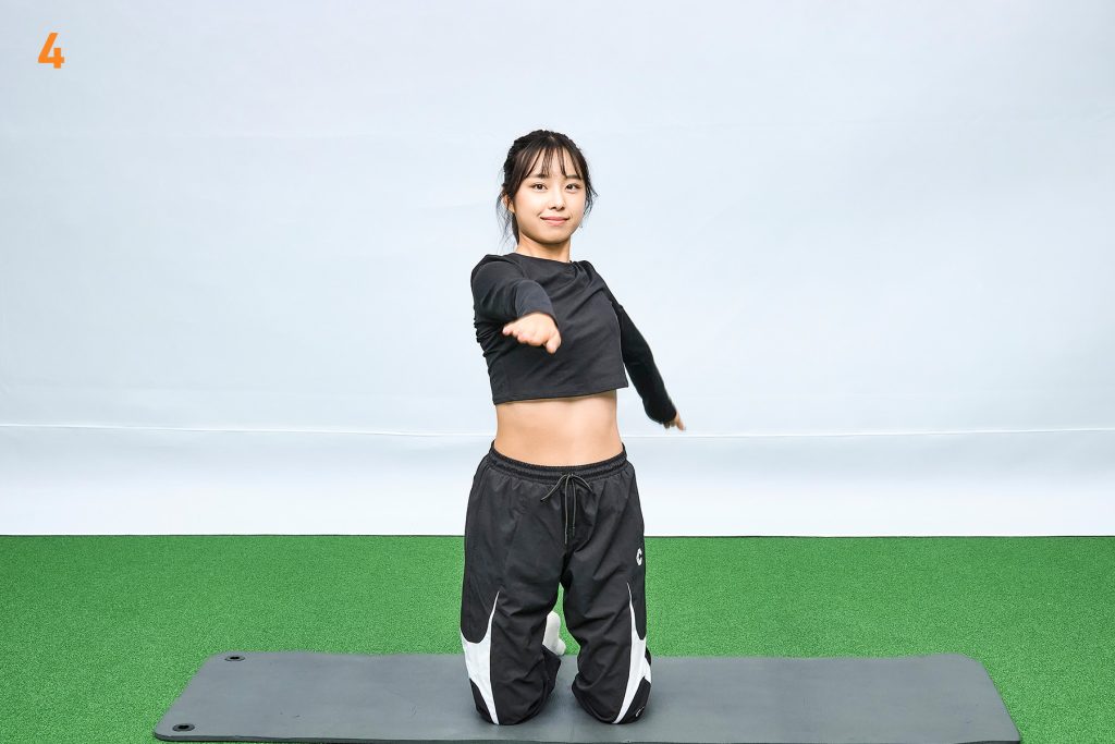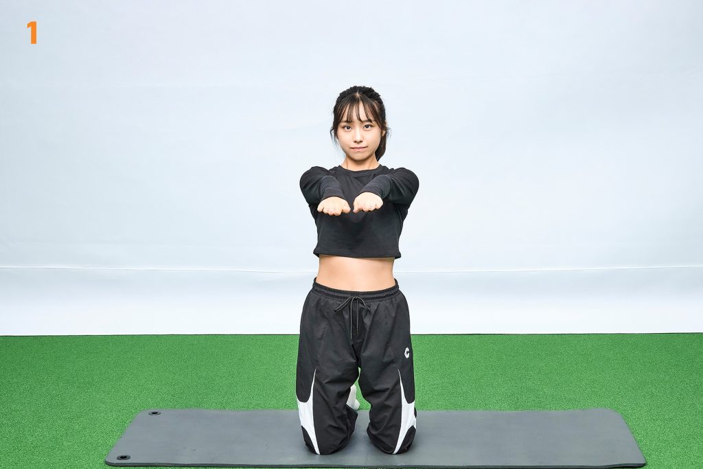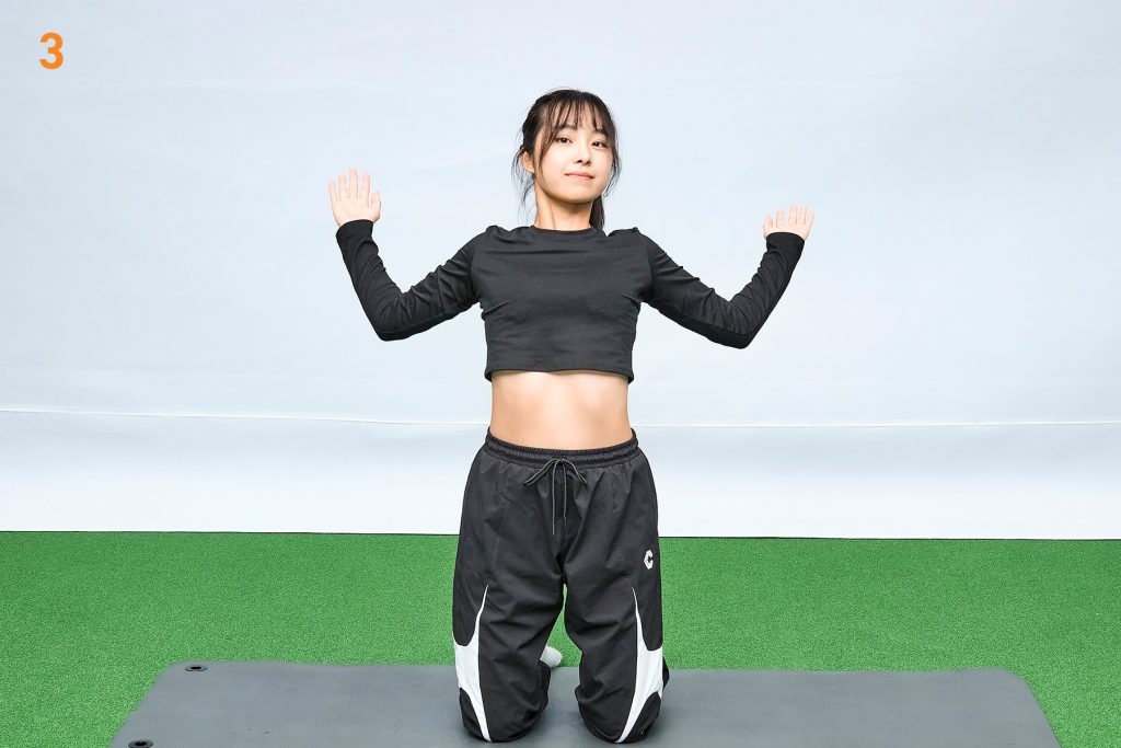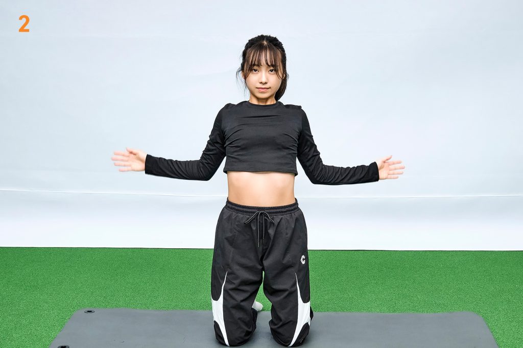 ひざ立ちの姿勢で両手をさらに前に出します。そこからバタフライのイメージで両腕を動かします。まず両手を横に広げて肩甲骨を寄せ、両手を上げて背中を反らせます。次に両手を下げながら背中を丸め、肩甲骨を開きます。1回1呼吸のペースで5回行ったら、後ろ回しも5回行います。(1呼吸 × 前後5回)