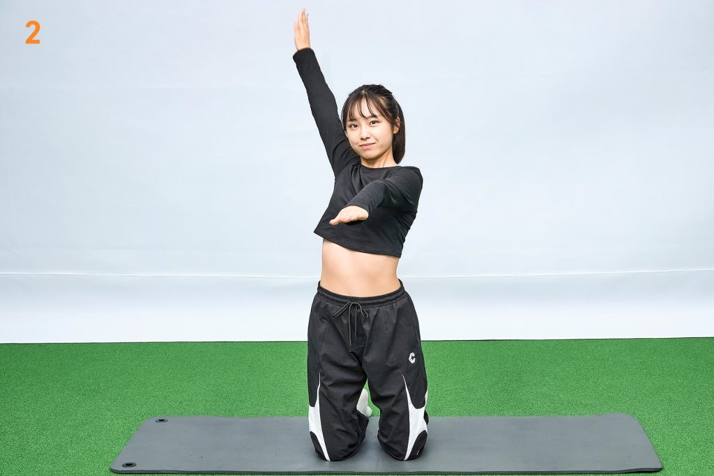 ひざ立ちになり、両手を前に出した姿勢でスタート。そこから背泳ぎをするように腕を交互に大きく回します。右腕を後ろに回したときは胸を右に向け、左腕を後ろに回したときは胸を左に向けます。左右1回転するごとに1呼吸(2~3秒)のペースで、10回繰り返します。(1呼吸 × 10回)