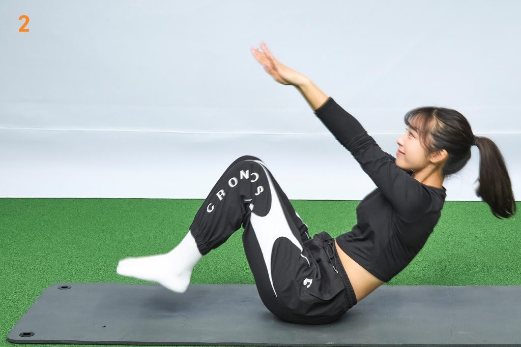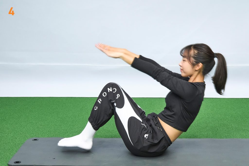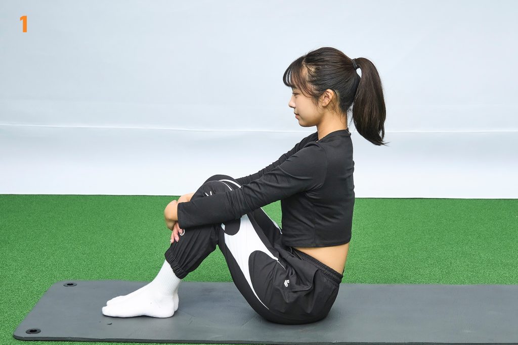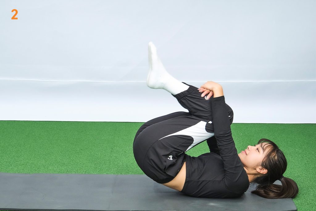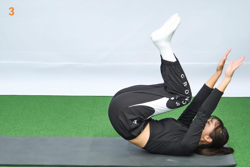 ひざを抱えて座った三角座りでスタート。そこから背中側にゴロンと転がります。頭がマットにつくくらいまで大きく転がり、反動を利用しながらお腹に力を入れて元の姿勢に戻ります。後ろに転がるときに息を吸い、起き上がるときに息を吐きます。1回1呼吸で10回繰り返します。(1呼吸×10回)