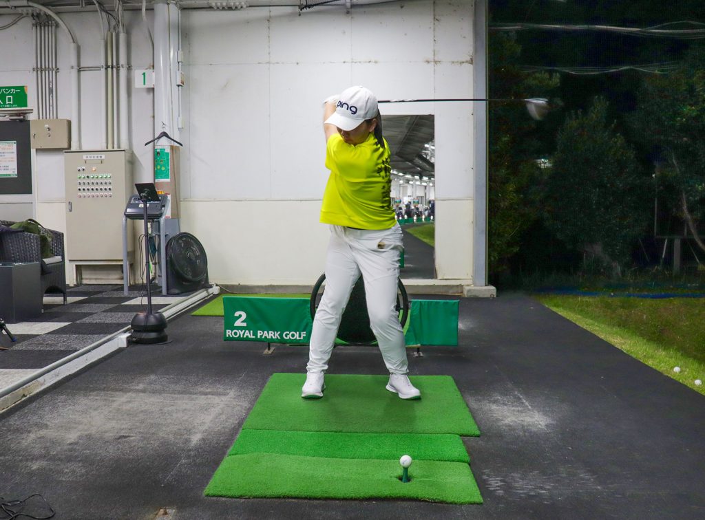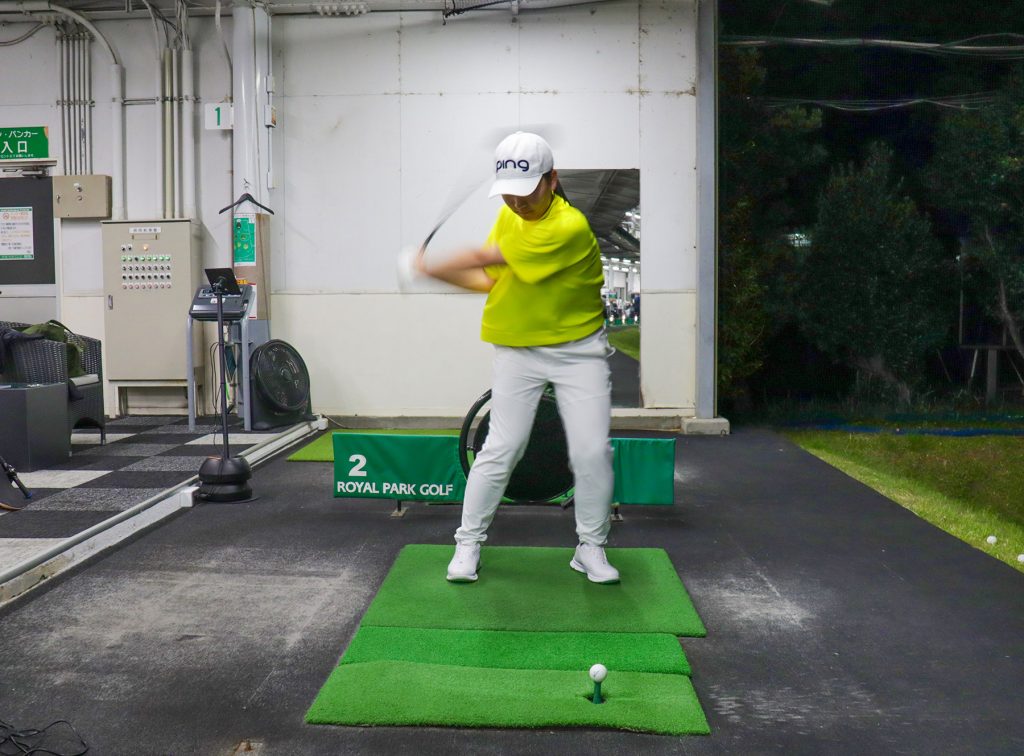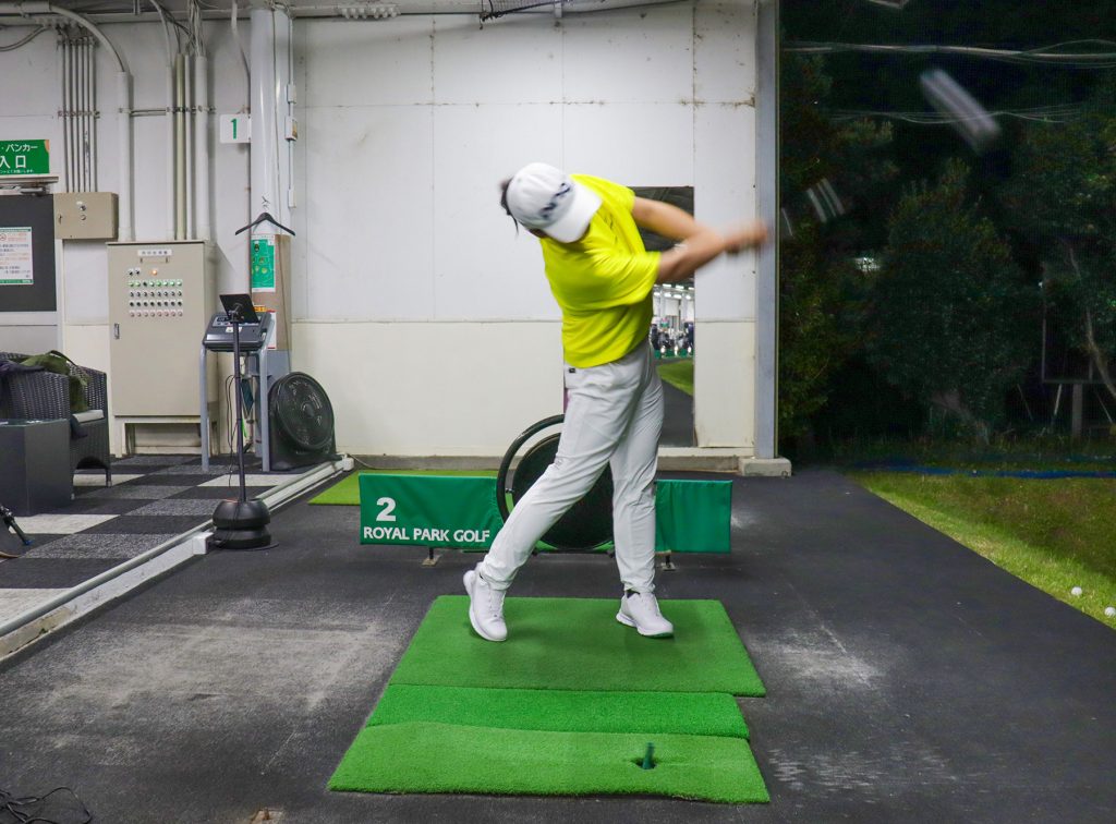 「自然な動きっていうのは、何度やっても同じになるから、安定感バツグン! クラブが上から入るでも、下から入るでもなく、体の内側から適度な上昇軌道でインパクトする。だから何度打ってもティーが飛ばない。打った後にティー探したことないでしょ?」