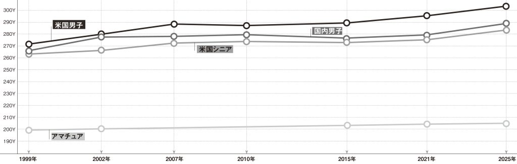 アマチュアのリアルな飛距離の実状はつかめたが、プロはどうなのか。本誌でアマチュアの飛距離計測を始めた1999年から、PGAツアー、日本男子ツアー、米シニアツアーの平均飛距離の推移をグラフ化した。3つのツアーで共通して、右肩上がりで飛距離が伸びている。