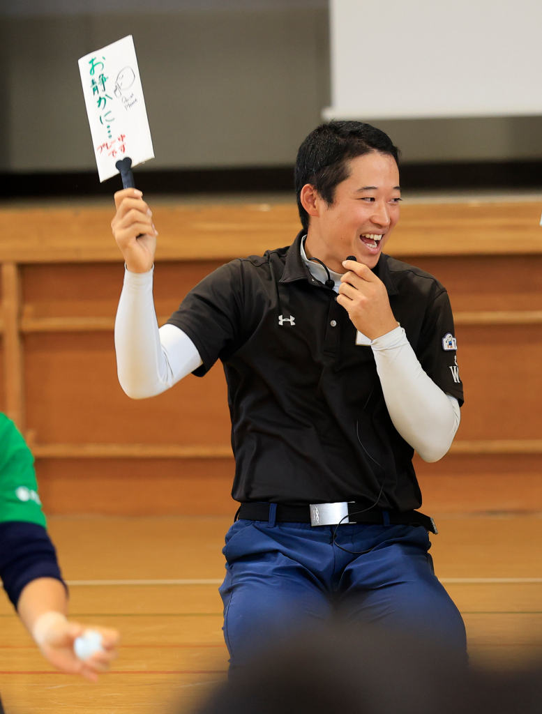 最初に伝えた、星が「キラキラ」するように両手を振る(両手を上に挙げ、ひらひらさせる)手話は、拍手と同様に使えるもので、人の応援をするときに使うものだ。「15歳も離れていますけれど、僕たちはラブラブです」という説明に、子どもたちは笑顔で手を「キラキラ」と動かしながら応える。後半には実際にパター対決のゲームをする。ゴルフなどしたことのない子どもたちに「プレッシャーがかかること、ドキドキハラハラすることを体験してください」とゴルフの神髄を教えるのである。また、ゲームを行う者たちの周りを生徒が囲めば、ゴルフの試合を見る疑似体験にもなる。試合などで使われる「お静かに!」のプラカードを手作りし、それを見せて静寂を誘うのもアイデアだ。