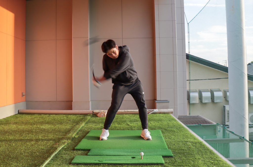 「以前、バックスウィングでウェイトシフトしていたのですが、今は軸を右側にズラしたくないので、バックスウィングで左ひざが内側に入らないように気を付けています。あと、ベタですが、ボールをよく見る! フォローでクラブが左腰ぐらいに来るまで見るようにしています」
