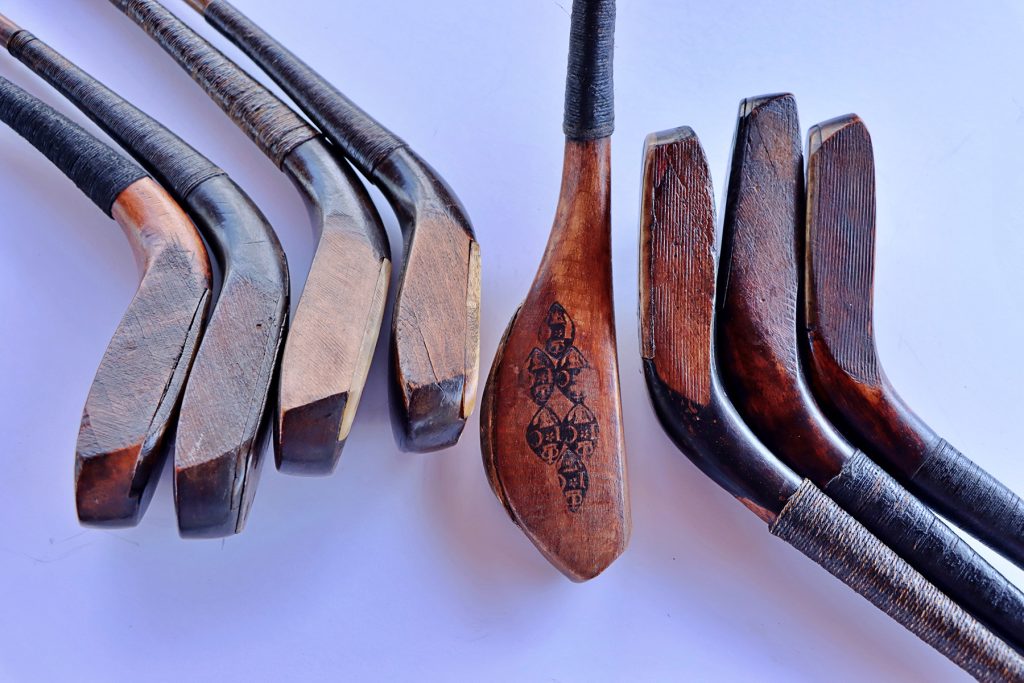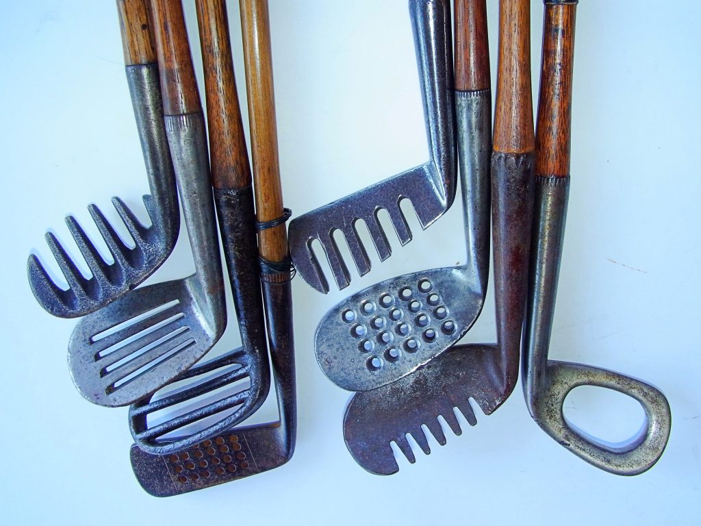 リンクスの状況に応じてアイアンクラブは作られ工夫されていった。すきのような形状やヘッドの中心が開いているのはウォーターアイアンでいずれも1900年代に作られた