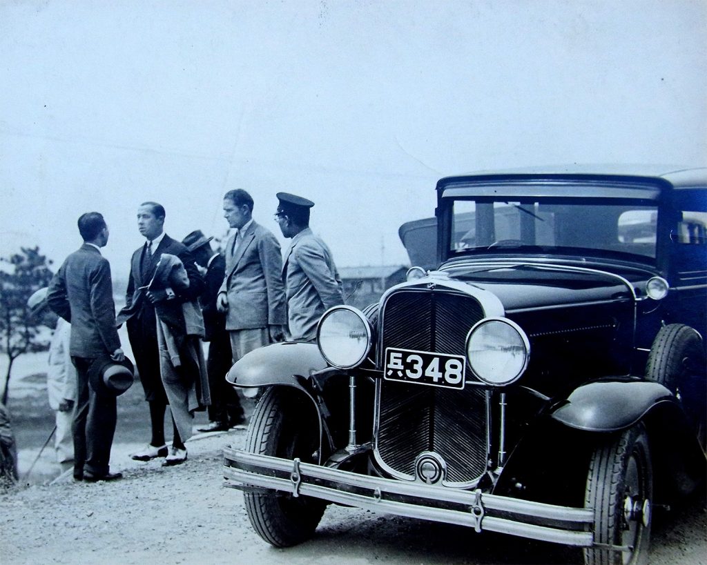 “プロの中のプロ”と称えられたウォルター・ヘーゲン(左から2番目)とツアー13勝ながら曲打ちを得意としたオーストラリアのプロ、ジョー・カークウッド(右から2番目)は1930、38年に来日。兵庫ナンバーの車が写っている写真は鳴尾GC(浜コース)を訪れた時と思われる