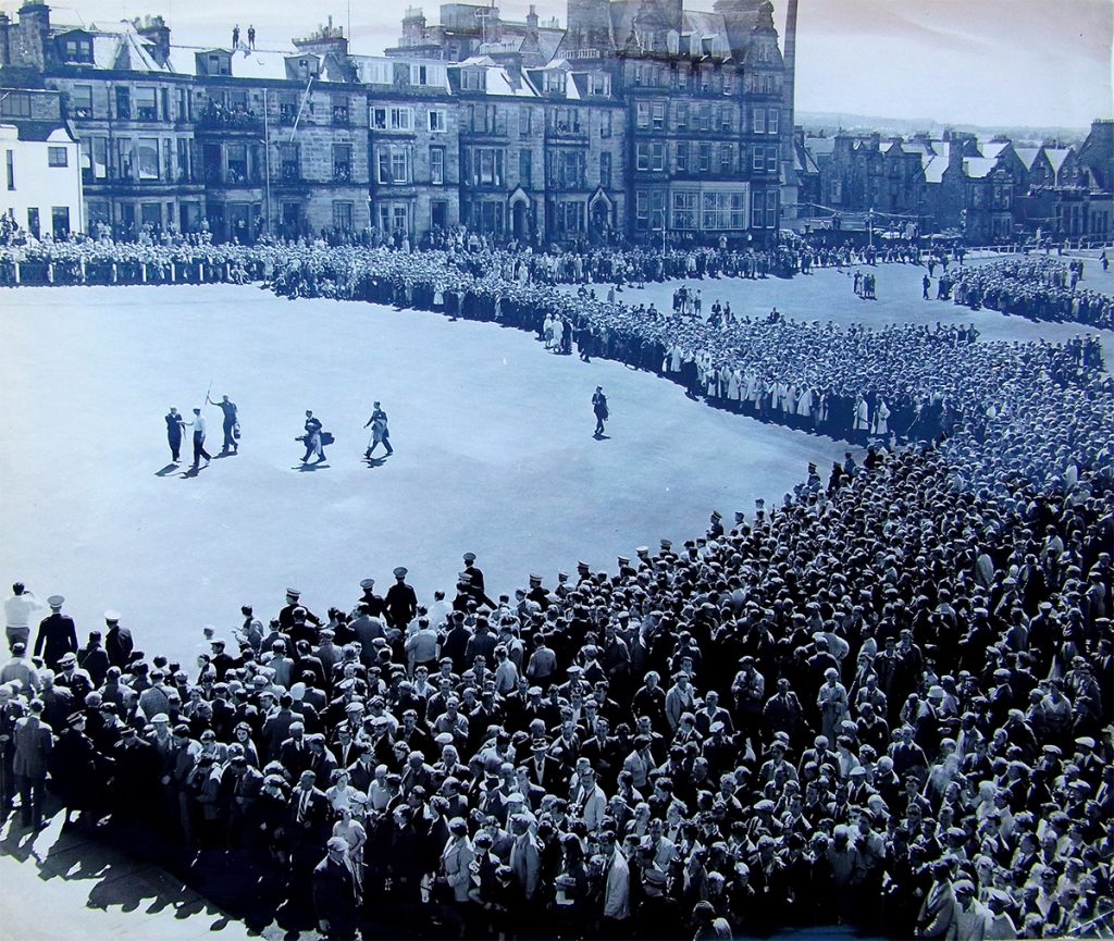 1960年の全英オープンは100回記念大会としてセントアンドリュースで行われ、オーストラリアのケル・ネーグルが1打差でアーノルド・パーマーを退けて優勝。18番グリーン上の黒い服装が優勝したケル・ネーグル(左)、白服は同伴競技者でアルゼンチンのロベルト・デ・ビセンゾ。同写真はセントアンドリュース大学にも所蔵されている