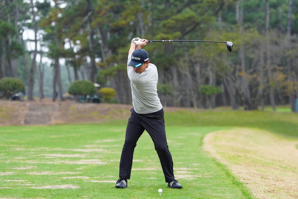 「ウィークグリップなので、トップでクラブが外側に上がりがちで、少し軌道から逸れる癖が出る。腕が長いので、トップもフォローも高く上がる。フィニッシュも高くてカッコ悪いからもう少し綺麗にたためるようにしたい」