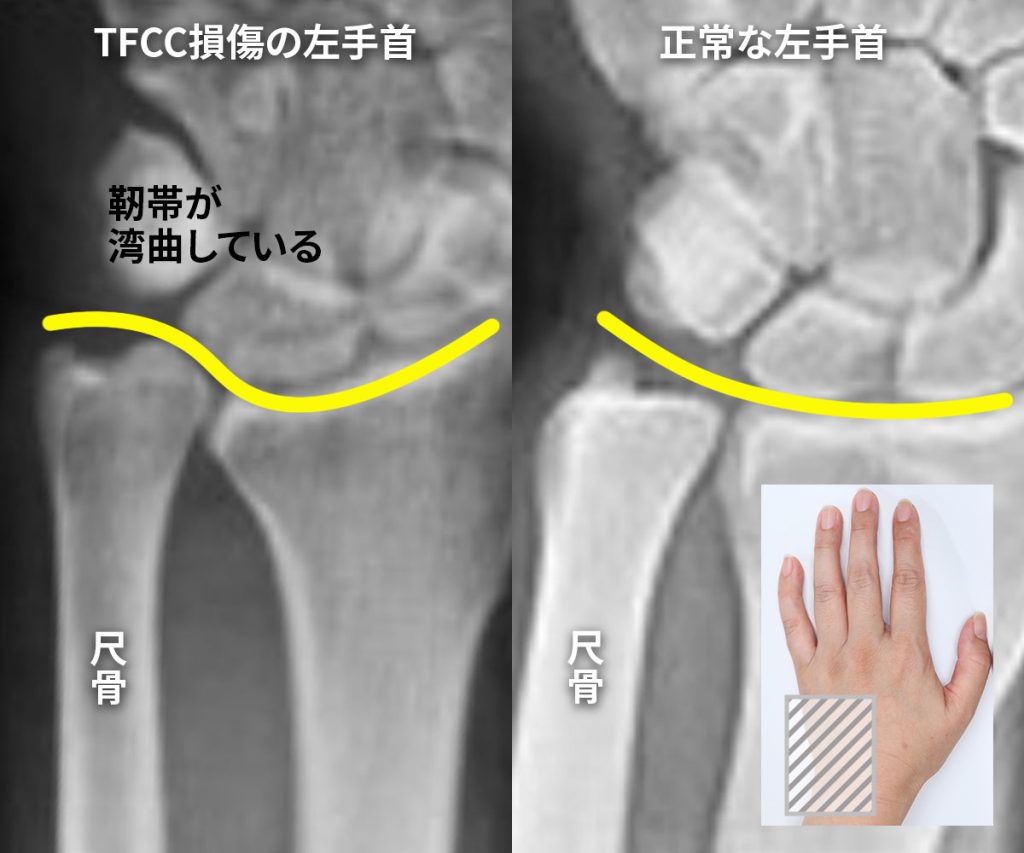 「TFCC損傷とは、三角線維軟骨複合体の損傷で、『Triangular Fibrocartilage Complex』の略で広く『TFCC損傷』と呼ばれます。具体的に、手首の小指側にある軟骨と靭じんたい帯の3つの複合体で、小指側にある尺骨と呼ばれる突起した骨の脇のくぼみ辺りにあります。ゴルフやテニスなどの手を使うスポーツ、重たいものを運んだりする重労働や私生活などで、手首を繰り返し酷使した場合に小指側にある尺骨が突き上がってしまうことがあり、その際に小指側の複合体から手首を横切る靭帯の一つが突き上がった尺骨の上をゆがみながら横切ることになり、靭帯が緩んでしまう状態を『TFCC損傷』といいます」